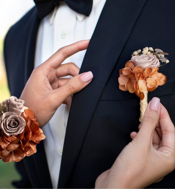 Corsages and boutonnieres are designed to be worn as a subtle floral statement during special occasions. Placed on the wrist, dress, or lapel, they help define roles, unify looks, and add a distinctive floral detail that completes the overall experience of an even